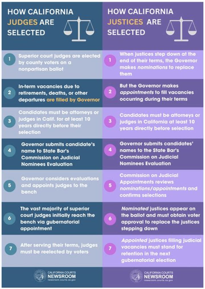 According to California’s constitution, judges of the supreme court and courts of appeal are nominated by the governor and must be confirmed by the commission on judicial appointments, which consists of the chief justice, the attorney general, and a presiding justice of the courts of appeal.