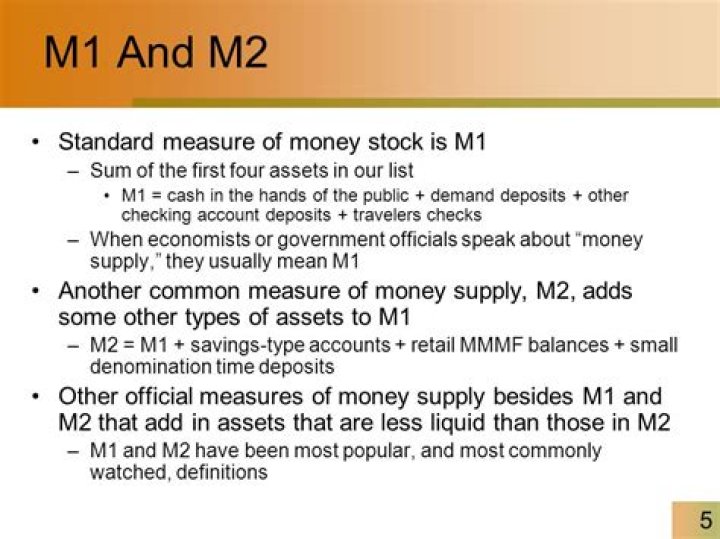 M1 includes those assets that are the most liquid such as cash, checkable (demand) deposits, and traveler’s checks. M2 includes M1 plus some less liquid (but still fairly liquid) assets, including savings and time deposits, certificates of deposit, and money market funds.