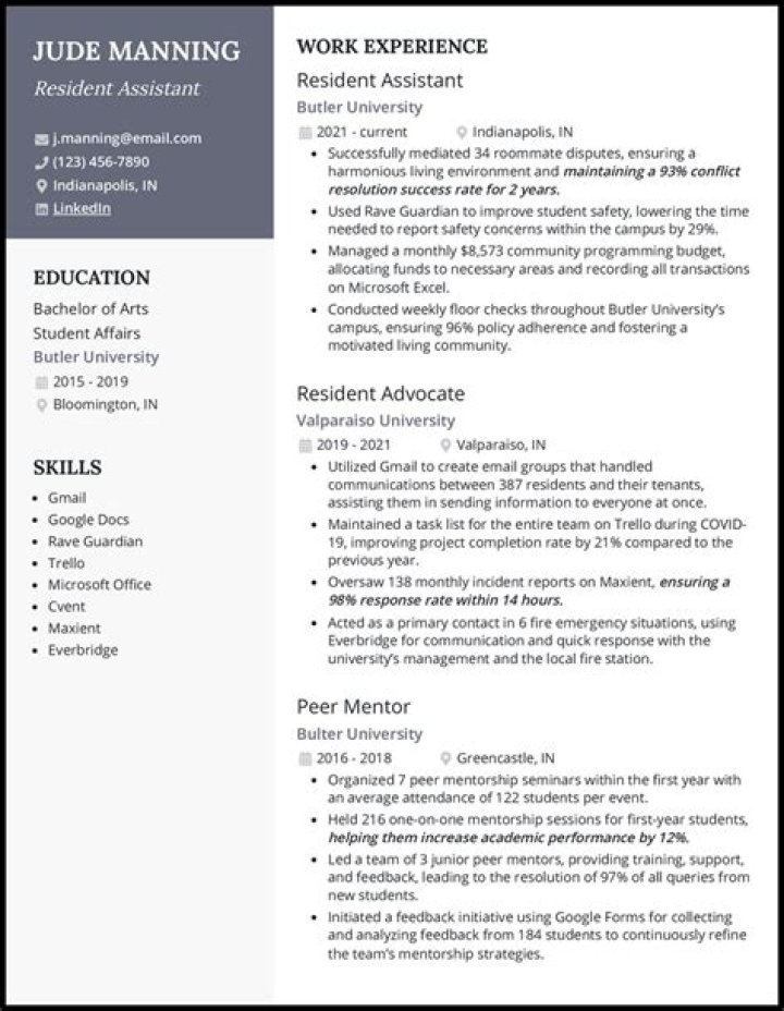 Being an RA could add a boost to your resume. Think of all the skills an RA learns: crisis-management, written and verbal communication, leadership skills, and more. These are all qualities you can effectively leverage in a job interview.