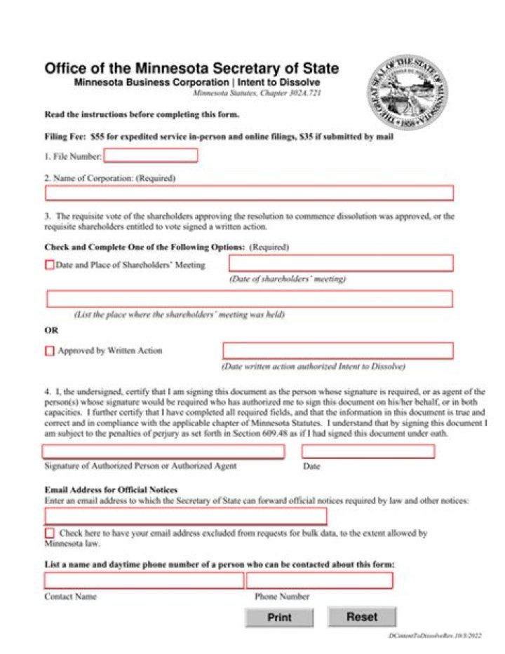 To dissolve your Minnesota corporation after it has issued shares, you must first file the Intent to Dissolve form with the Minnesota Secretary of State (SOS). Then the corporation will file the Articles of Dissolution Chapter 302A. 7291 or 302A. 727.
