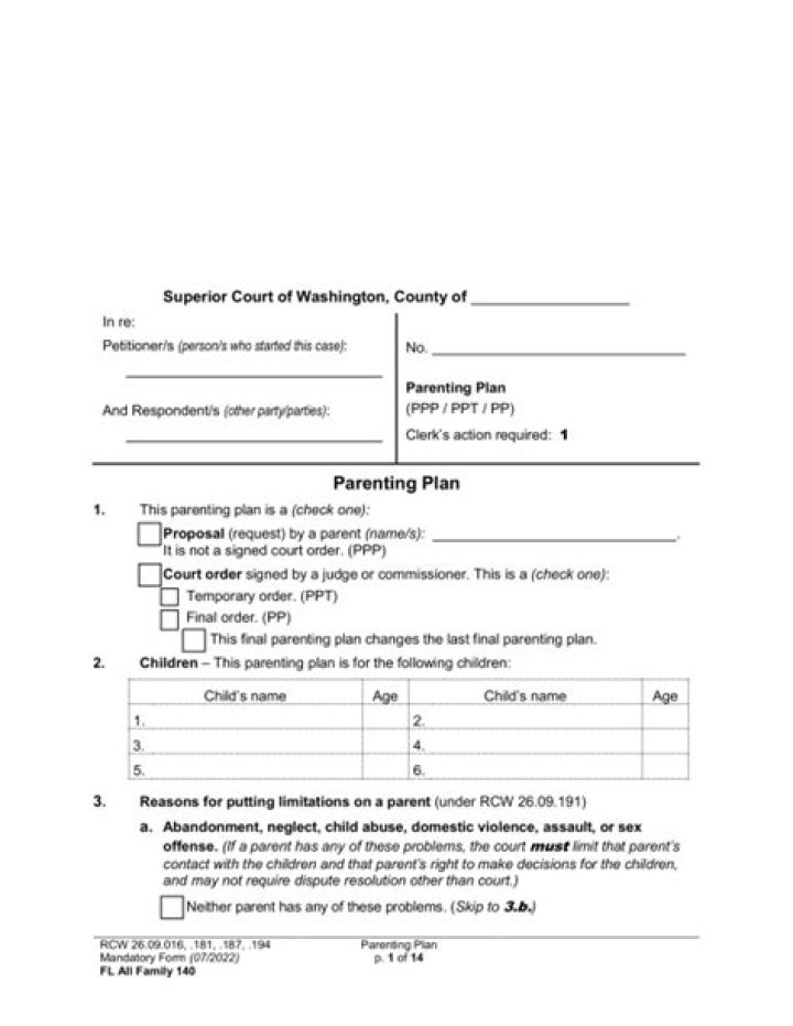 You will usually file a parentage case or a petition for a parenting plan. If the parents agree on a proposed Parenting Plan, the court will usually approve it. If you do not agree, the court will enter a Parenting Plan after a hearing or trial.