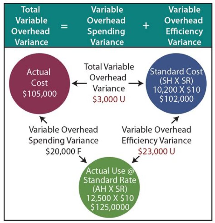 - Variable overhead spending variance = (Actual hours worked × Actual variable overhead rate) – (Actual hours worked × Standard variable overhead rate)