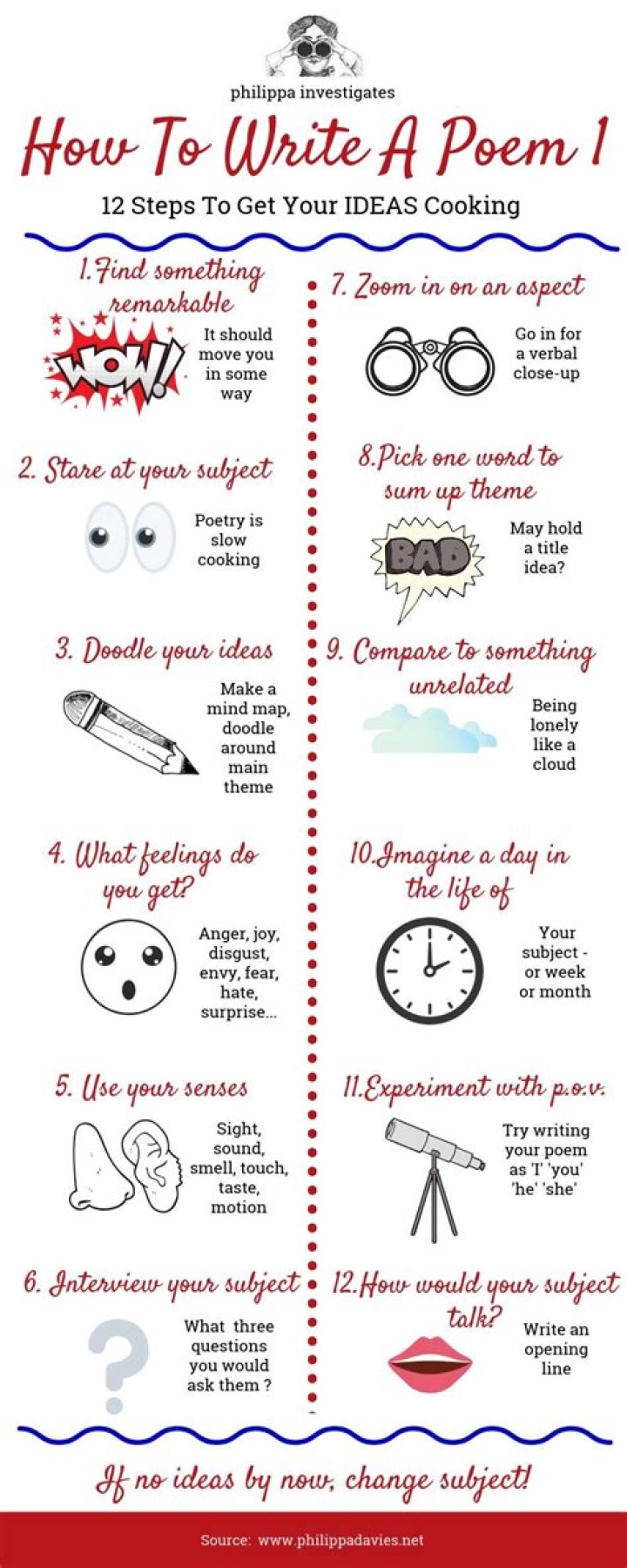 Begin with the seed of your poetry idea; perhaps it’s something as small as an image or a phrase. Force yourself to jot down as many words, ideas, or images as you can without stopping. Keep writing until you’ve filled the entire page with writing ideas or poetic phrases.