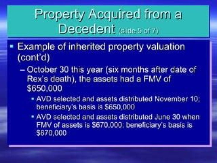 The basis of property inherited from a decedent is generally one of the following: The fair market value (FMV) of the property on the date of the decedent’s death. The FMV of the property on the alternate valuation date if the executor of the estate chooses to use the alternate valuation.