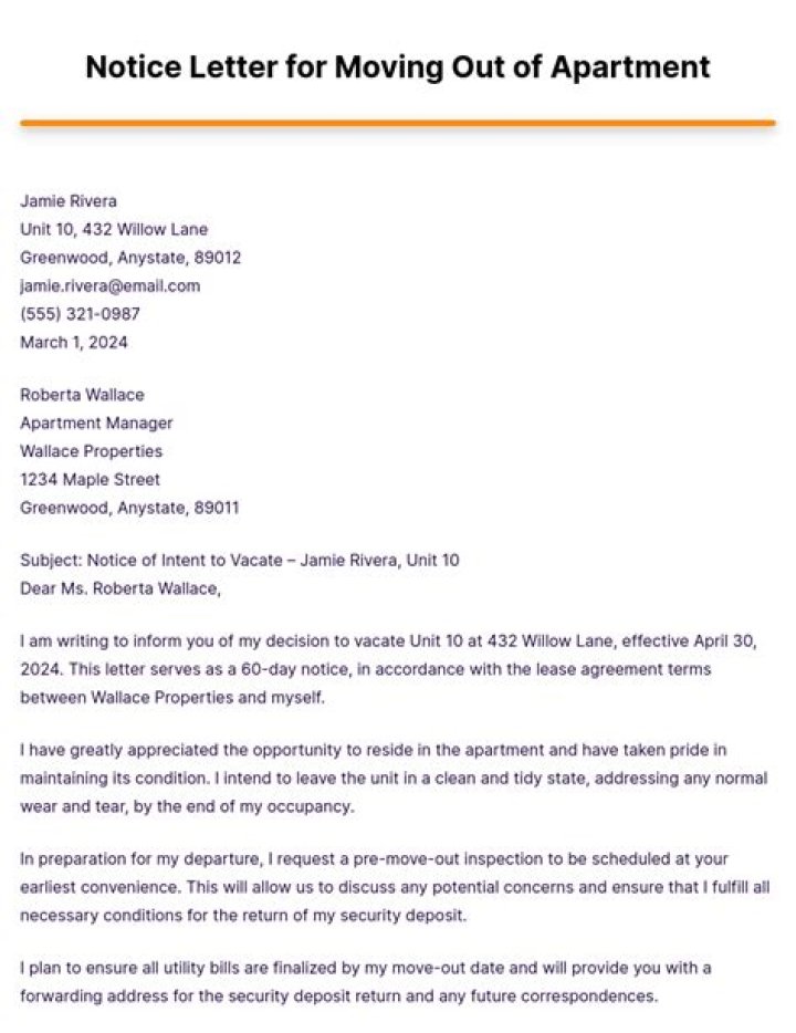 Notice to Terminate the Lease A month-to-month tenant must give written notice of lease termination at least one full month prior to moving. Most yearly leases require a 60 to 90 day notice from the tenants in order to terminate the lease.