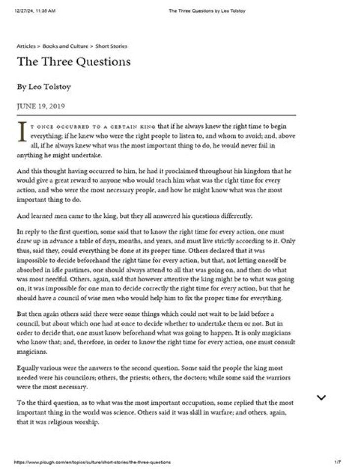 “The Three Questions” is a short story by Russian author Leo Tolstoy (Lev Nikolayevich Tolstoy) first published in 1885 as part of the collection What Men Live By, and Other Tales.