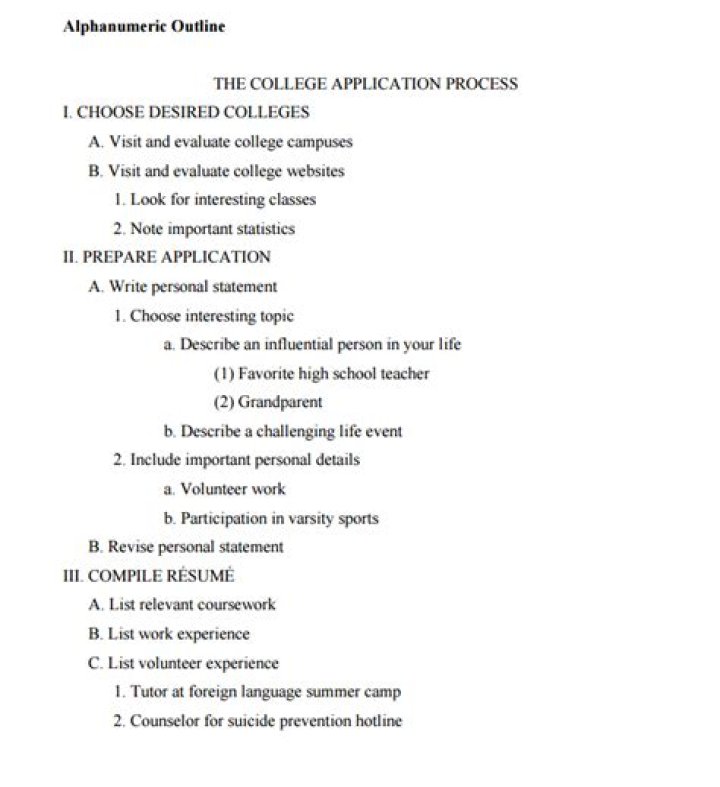 Alphanumeric Outlines This is the most common type of outline and usually instantly recognizable to most people. The formatting follows these characters, in this order: Roman Numerals. Capitalized Letters. Arabic Numerals.