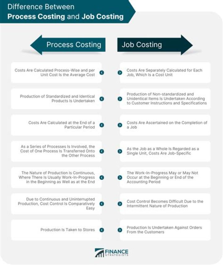 Differences Between Job Costing and Process Costing Production: In job costing, production is customized, while it is standardized in process costing. In process costing, the cost is first determined by the process and then decided based on the number of units produced.