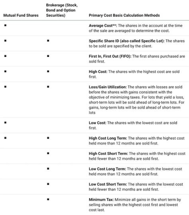 To do this, you’ll need to specify one of these cost basis methods at the time of sale: Average Cost – an average of the total purchase cost divided by the total shares held. This is only available for funds. LIFO – or Last In, First Out sells shares in the most recent lot ID first.