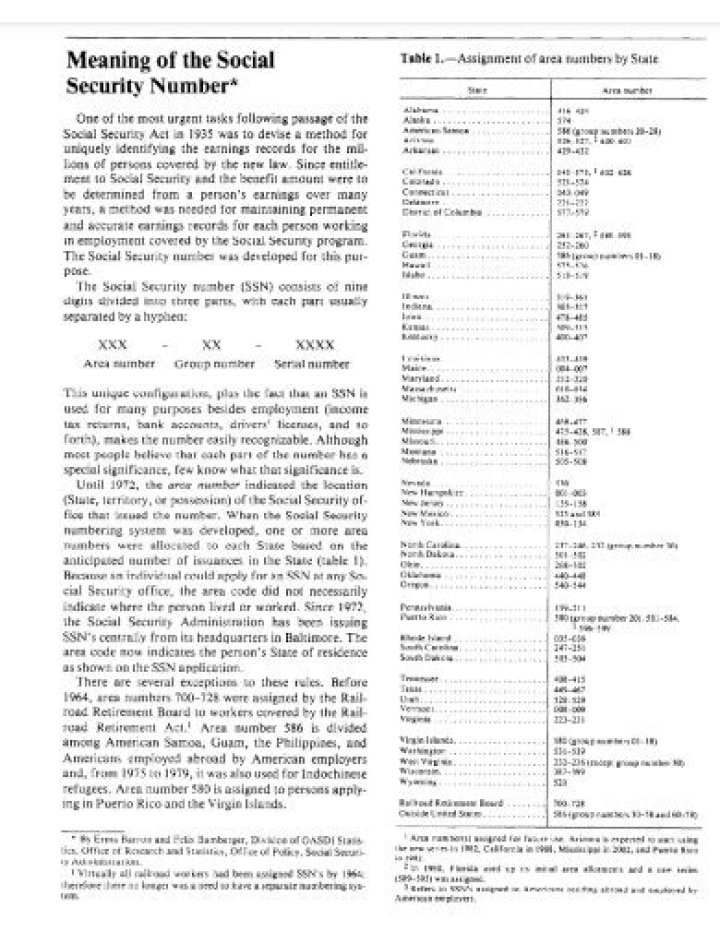 Serial number 0000 is never used. Each State goes through all of its area numbers with group number 01 and serial numbers 0001-9999 and 7999 before using group number 03. Thus, 989,901 SSN’s can be issued for each area number. Additional area numbers have been designated for these locations.