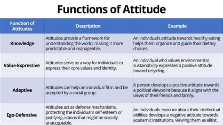 Attitudes serve four major functions for the individual: (1) the adjustments function, (2) the ego defensive function, (3) the value expressive function (4) the knowledge function. Ultimately these functions serve people’s need to protect and enhance the image they hold of themselves.