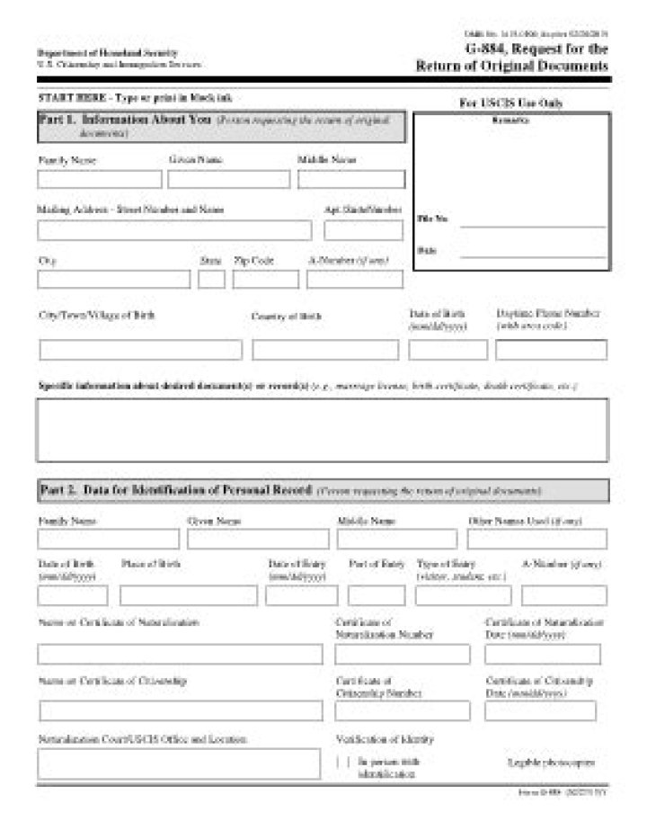 Use Form G-884, Request for the Return of Original Documents, to request the return of original documents submitted to establish eligibility for an immigration or citizenship benefit. NOTE: If you filed a form that requested original documents, we will automatically return those originals to you.