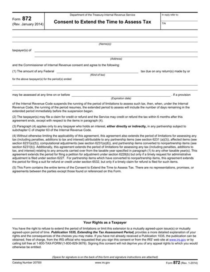 Form 872 is fortunately very straightforward, simply requesting your taxpayer identification number (TIN), name, address, and signature. The form will reveal the federal tax due, an expiration date, and your rights as a taxpayer.