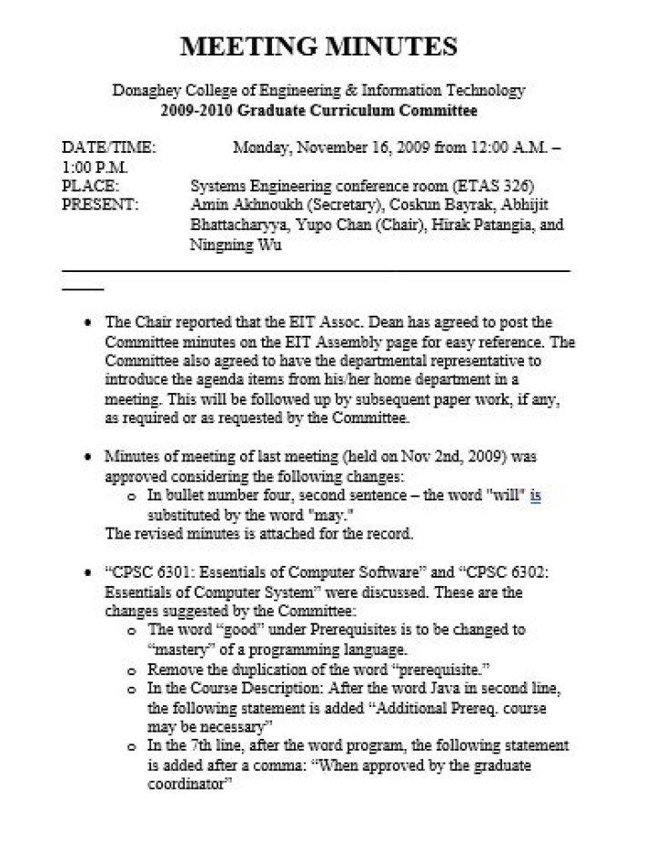 Minutes are the official written record of the meetings of an organization or group. Using Robert’s Rules of Order Newly Revised (RONR), the minutes should contain mainly a record of what was done at the meeting, not what was said by the members.