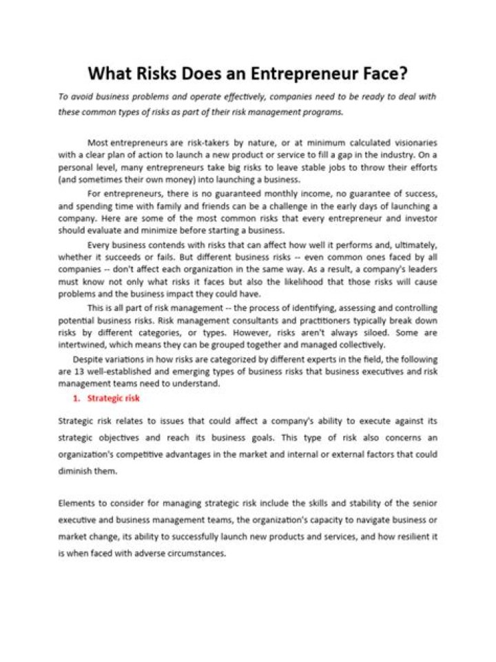 Key Takeaways Entrepreneurs face multiple risks such as bankruptcy, financial risk, competitive risks, environmental risks, reputational risks, and political and economic risks. Entrepreneurs must plan wisely in terms of budgeting and show investors that they are considering risks by creating a realistic business plan.