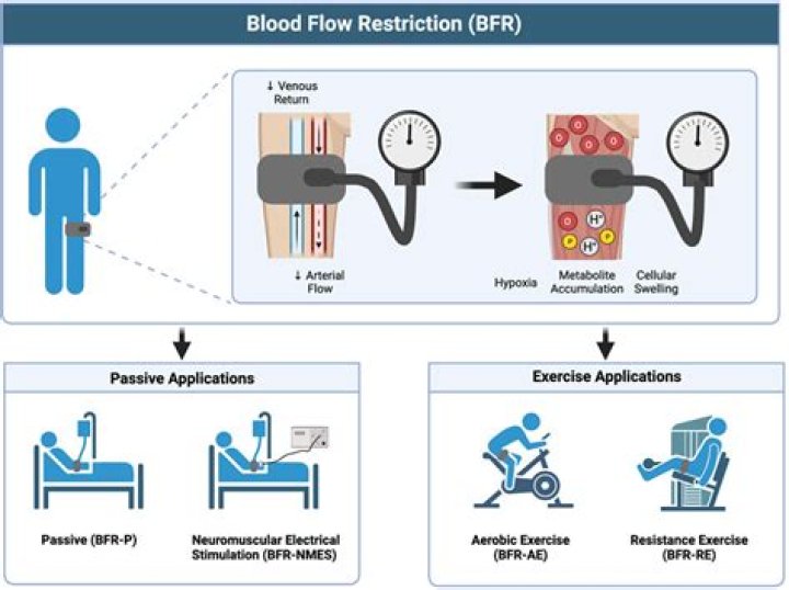 BFR requires the application of a device similar to a blood pressure cuff or tourniquet to safely compress the blood vessels underneath. The goal is to use apply enough pressure to completely restrict the venous blood flow (blood LEAVING the muscle), while allowing arterial blood flow (blood going into the muscle).