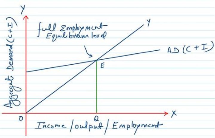 According to the Keynesian theory, the equilibrium level of income in an economy is determined when aggregate demand, represented by C + I curve is equal to the total output (Aggregate Supply or AS).
