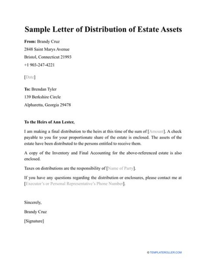 Estate Distribution Letter This page contains a sample letter for distributing assets in an estate to the heirs, beneficiaries or devisees. If you are the executor, personal representative or administrator of a deceased person’s estate, you may need to send this type of letter when you are ready to settle or close the estate.
