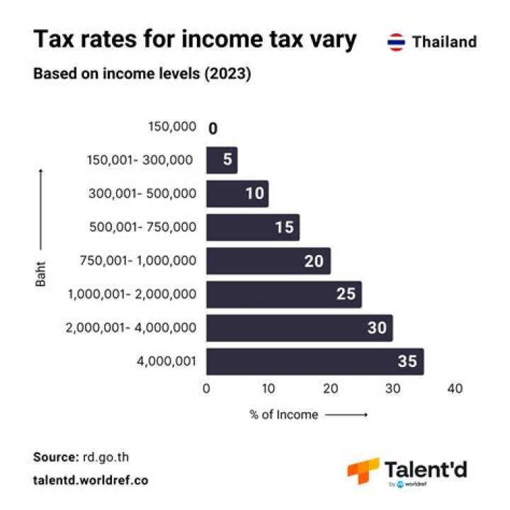 Thailand’s tax rates are progressive and rise according to earnings. Expats who earn less than THB 150,000 will be exempt from income tax, while those who earn over THB 5,000,000 per year will be taxed at thirty-five percent.