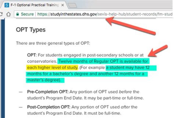 Most students are eligible to apply for a total of 12 months of OPT at each higher degree level. OPT can only be used once per higher degree level even if you have multiple degrees per level (e.g. OPT based on a Bachelor’s degree and then OPT based on a Master’s degree or PhD).